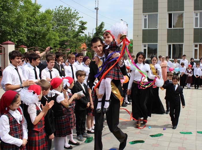 Последний звонок прозвенел и для некоторых ребят из 9-ых классов. На торжественную линейку, посвященную этому волнующему событию, в школе собрались все учителя, ученики, гости, родители выпускников и не только. Пришли и родители первоклашек – у их детей тоже важное событие: во-первых, они преодолели первый школьный порог и перешли во второй класс, а во-вторых, им, по традиции, предоставлена честь приветствовать выпускников. Замдиректора школы по воспитательной работе, она же классный руководитель выпускников Марьям Андиевна Сальгириева объявила о начале праздника.