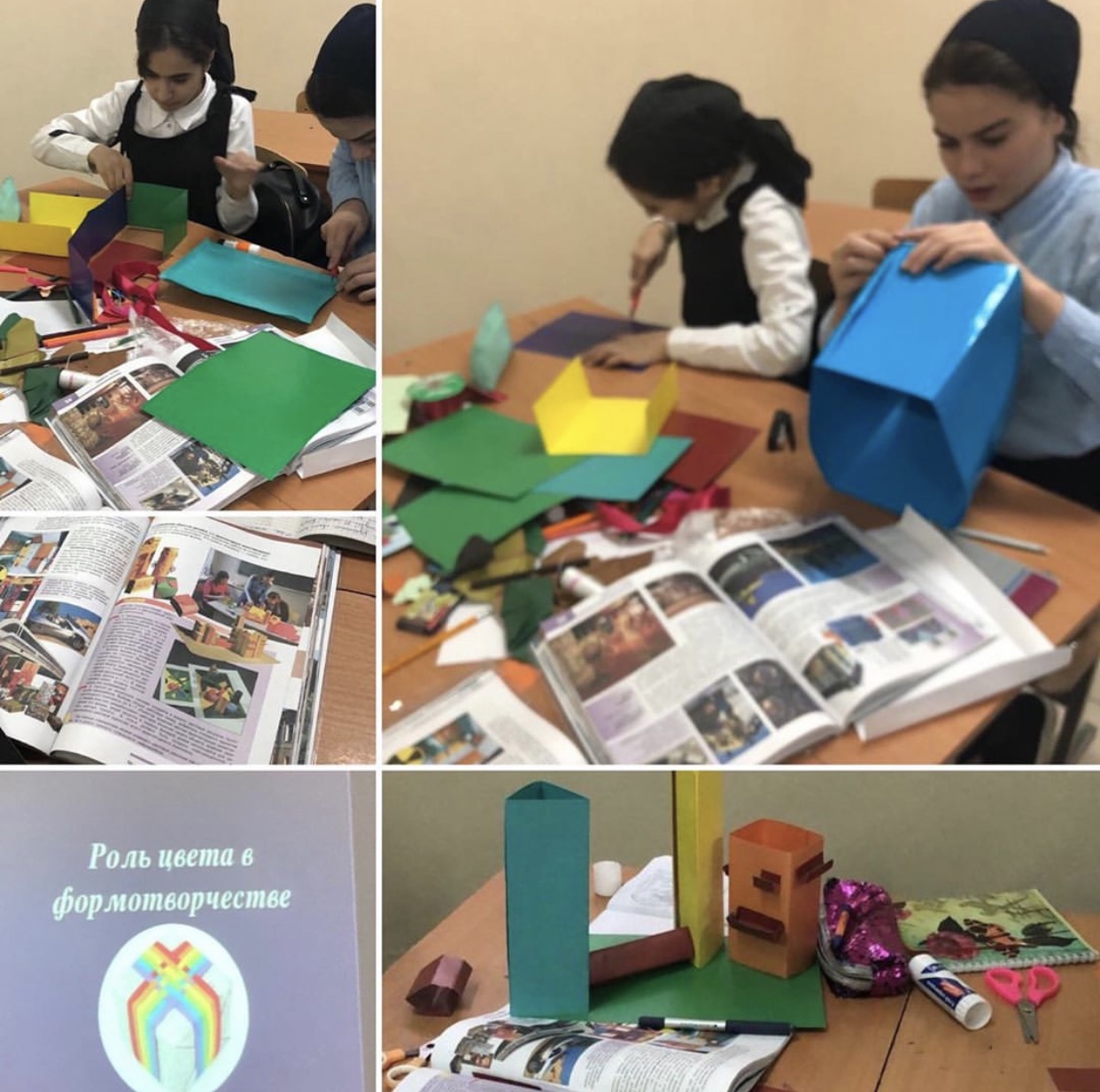 16.01.2020 г в 7 «Б» классе прошёл урок рисования по теме: «Роль цветов в формотворчестве». Характер и роль цвета в архитектуре и дизайне отличаются от цвета в природе. Деревья, травы, небо имеют цвет данный им природой, а цвет здания или вещи сочинен художником. На уроке рисования учащиеся попробовали себя в роли архитекторов-художников в создании макета жилого здания с цветными витражами.