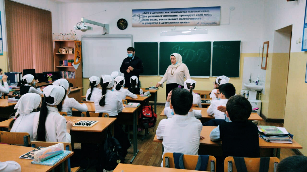 Сегодня в МБОУ "СОШ №20 им. М.С.Ташухаджиева" г.Грозного прошла беседа с учащимися младших классов по профилактике дорожного движения.