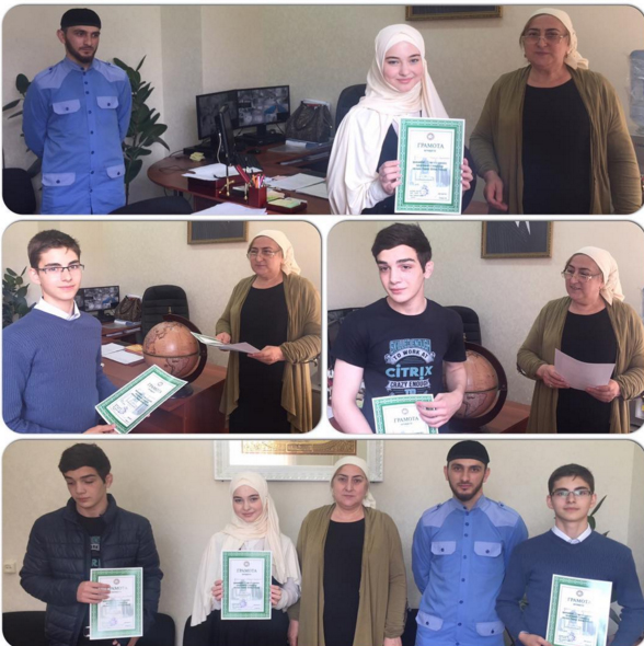 Директор школы вручила грамоты ребятам, занявшим призовые места в школьном этапе Республиканского конкурса, приуроченного к священным месяцам Раджаб, Ша1бан и Рамадан.