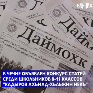 Республиканская газета «Даймохк», при поддержке Министерства Чеченской Республики по национальной политике, внешним связям, печати и информации проводит республиканский конкурс на лучшую статью среди школьников 8-11 классов «Кадыров Ахьмад-Хьаьжин некъ», посвященный 73-летию со дня рождения Первого Президента Чеченский Республики, Героя России Ахмата-Хаджи Кадырова.