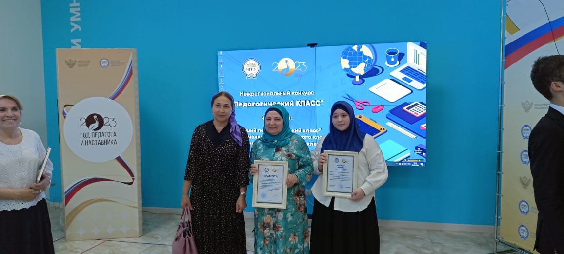 Звание «Лучший ученик педагогического класса 2023 года»забрала Анастасия Мухина — Гимназия №14 г. Грозный, два вторых места разделили Анжела Ахъядова — школа Терра Нова им. Ш. Дудагова и Айшат Мусаева – школа №20 им. М.С. Ташухаджиева г. Грозный. На третьем месте расположилась Радима Есиева – средняя общеобразовательная школа п. Долинский.