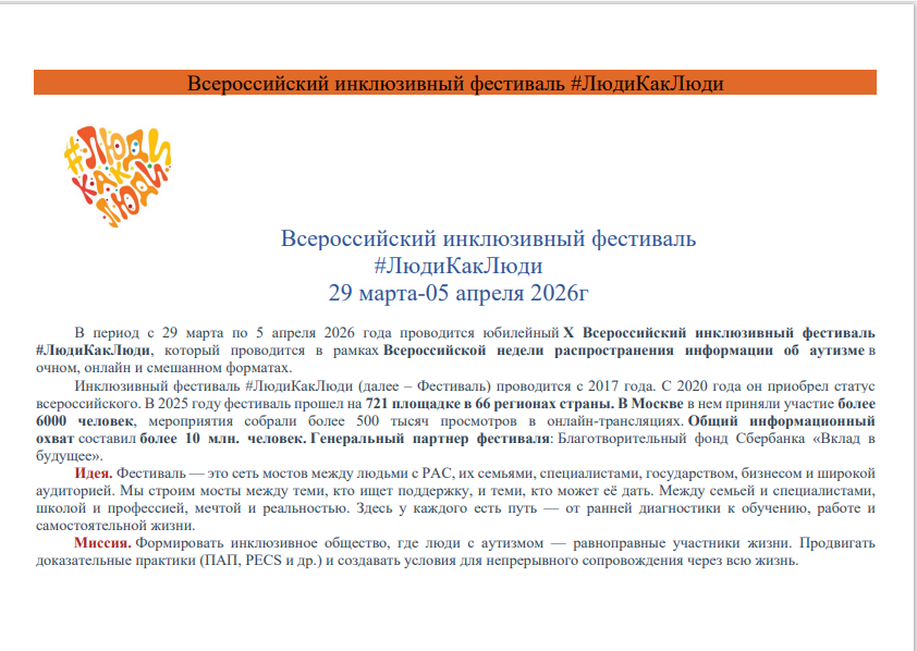 03.04.2026Всероссийский инклюзивный фестиваль#ЛюдиКакЛюди29 марта-05 апреля 2026гВ период с 29 марта по 5 апреля 2026 года проводится юбилейный X Всероссийский инклюзивный фестиваль#ЛюдиКакЛюди, который проводится в рамках Всероссийской недели распространения информации об аутизме вочном, онлайн и смешанном форматах.Инклюзивный фестиваль #ЛюдиКакЛюди (далее – Фестиваль) проводится с 2017 года. C 2020 года он приобрел статусвсероссийского. В 2025 году фестиваль прошел на 721 площадке в 66 регионах страны. В Москве в нем приняли участие более6000 человек, мероприятия собрали более 500 тысяч просмотров в онлайн-трансляциях. Общий информационныйохват составил более 10 млн. человек. Генеральный партнер фестиваля: Благотворительный фонд Сбербанка «Вклад вбудущее».