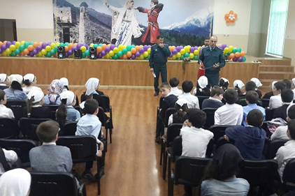 В тот же день проведены мероприятия по правилам безопасного поведения детей в условиях наступающих летних каникул. Были приглашены сотрудники различных организаций: старший дознаватель ОНД по Заводскому району Цуев М.Ю., старший инспектор ОНД Джукаев Д.Л., инспектор ОНД Бажаев М-Б.С., дознаватель по Заводскому району Баширов И.К. Гости рассказали и показали наглядно, как нужно действовать в чрезвычайных ситуациях: применение огнетушителя, наложение современных пневматических шин, надевание противогаза, провели демонстрацию спасательного инструмента.