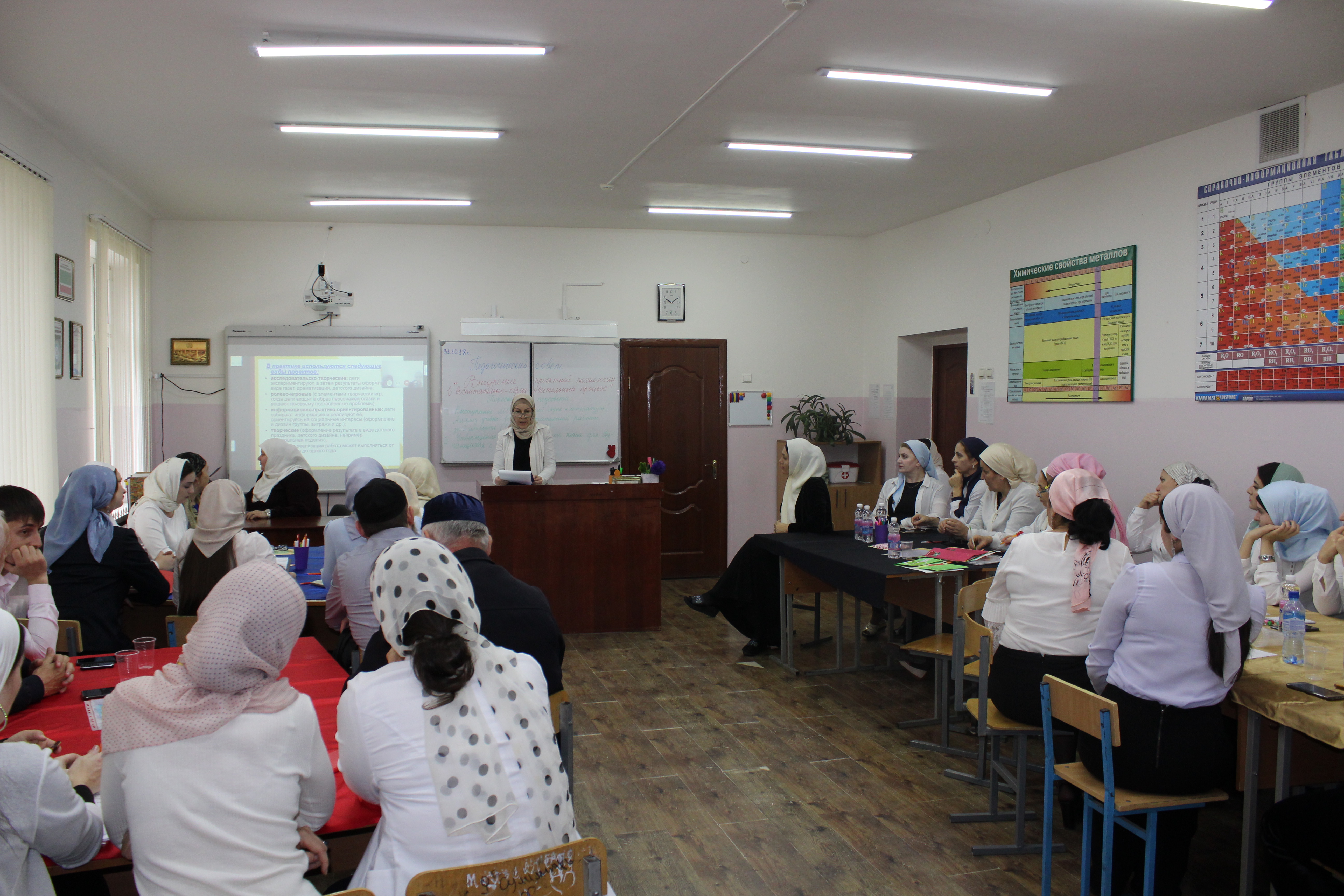 31.10.2018Тема педсовета была выбрана не случайно: в школах страны введена защита проекта в 9-х классах. Заслушали доклады учителей о проектной работе на уроках (Товсултанова П.Х., Арсаханова М.М., Шахбулатова А.С.), Ибакова А.Б. и Джамалдинова Р.А. поделились опытом практической работы. Педсовет продолжился практической работой в группах, которым был предоставлен перечень тем проектов, из которых участники выбрали подходящую им и выполнили проекты. Педсовет прошёл в очень творческой атмосфере.