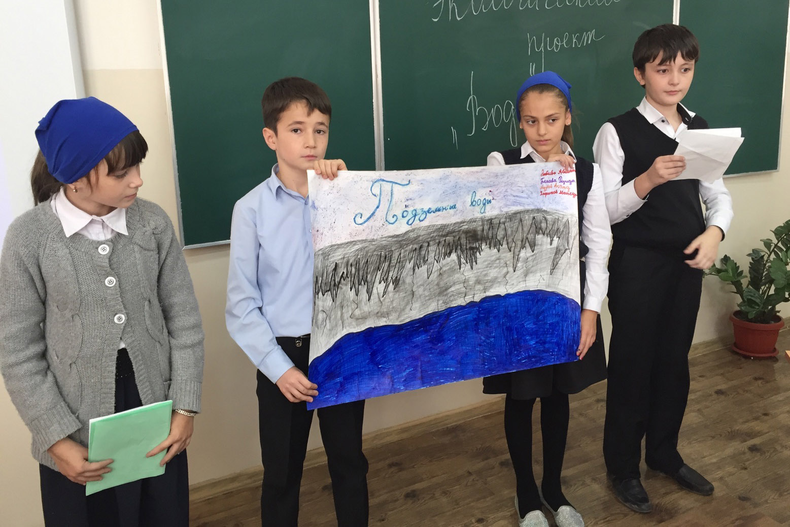 Защита проектов проходила у учащихся 5 "б" класса. Ребята подошли к заданиям очень ответственно и весьма интересно: они нарисовали плакаты с изображением водоемов, а также принесли на урок емкости с водой и проводили различные занимательные опыты.