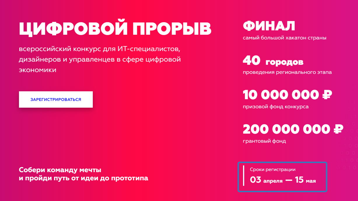 Лучшие участники попадут на самый большой хакатон страны. Победители получат денежные призы и гранты, а также возможность реализовать свои проекты.